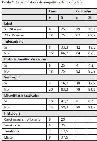 Un total de 120 sujetos fueron incluidos en el estudio, 24 casos con cáncer testicular y 96 controles. LA edad media de los casos fue de 23,92 años y de los controles 23,41 años. De los casos los tipos de cáncer más frecuente fueron los de composición mixta (carcinoma embrionario más teratoma), seguido del seminoma puro y los carcinomas embrionarios.